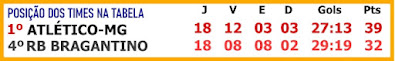 Vamos falar do jogo do "campeão da rodada". Um campeão que poderia estar mais feliz na liderança mas... continua com uma boa vantagem em relação aos perseguidores (esse texto foi usado na rodada passada rsrsrsrs). Veja abaixo a posição dos dois times que se enfrentaram no domingo, na classificação depois do final da rodada:
